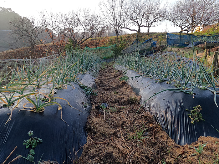 その向こう側にはニンニクの畝があります