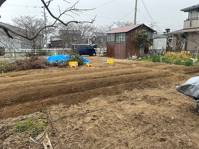 昨日の午後雪が舞う中堀江の畑に畝立てをしました