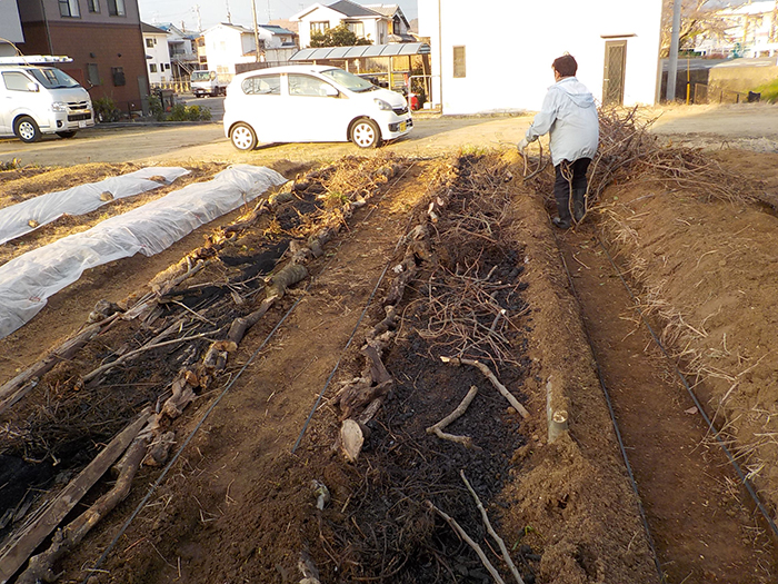 畝を髙畝にして去年入れた木が菌ちゃん畝の役目を果たし