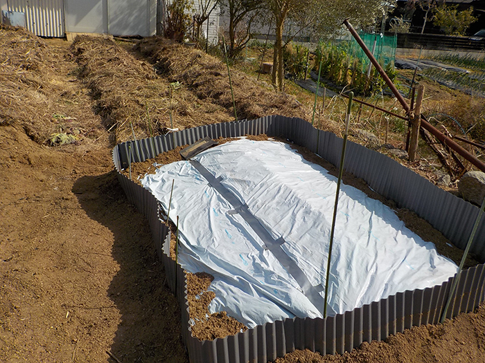 さらに土を乗せてしっかりと雨がかからないように白黒マルチでカバー