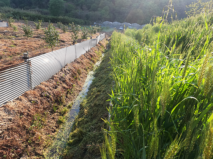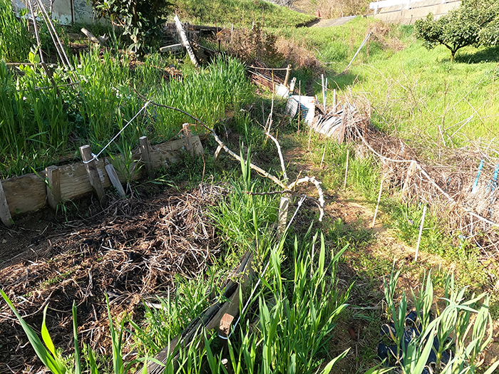 山の段々畑1番下の畝下に水路がある