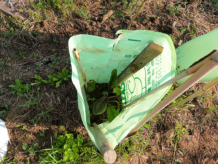 肥料袋の下側を切って筒を作り4隅に棒を立てて茄子苗に被せます