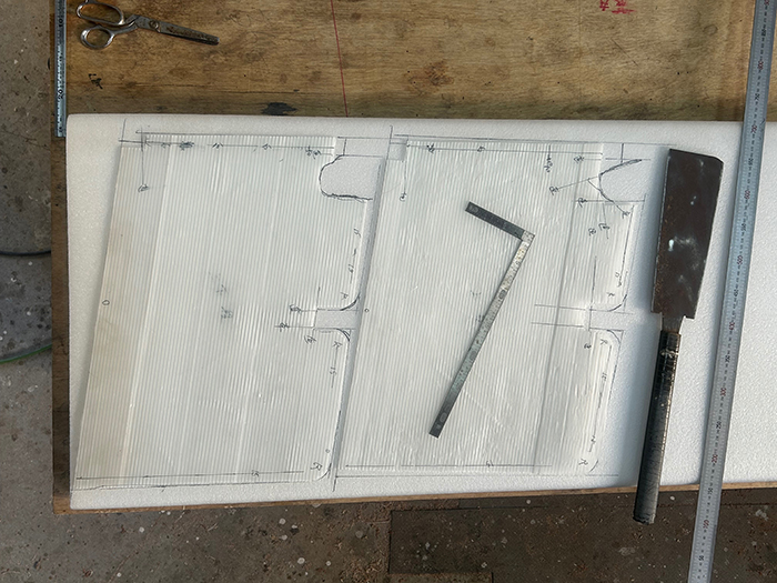 右に見えるノコは発泡体カットの為に作った物