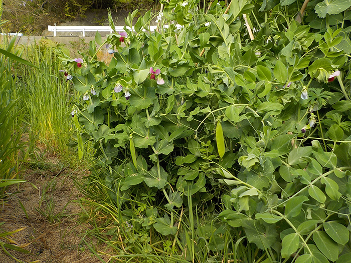 沢山のニンニクやエンドウ豆は今を盛りと出来ている