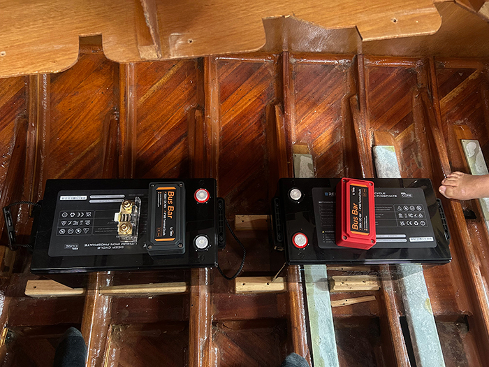 メインテーブルの下にエアコン用バッテリー2個