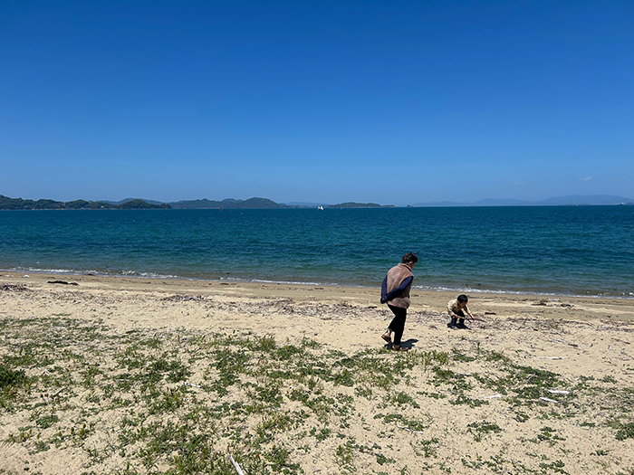 初め松ぼっくりを拾って居たが次は海岸に散らばる木の枝を集め出した
