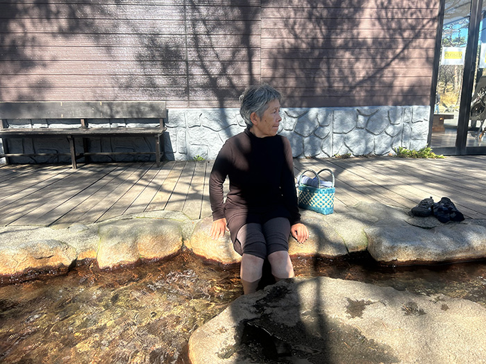和江さんの右に広がる葉っぱが白いのは霜ではない