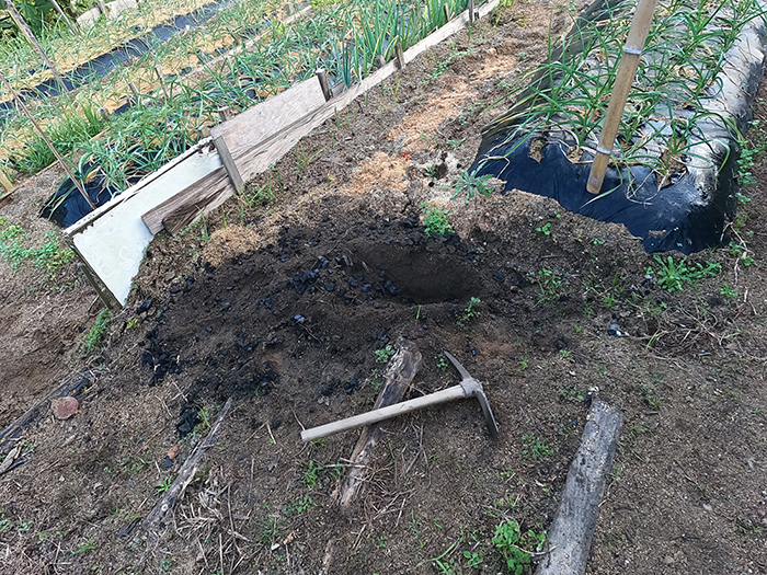 その次が土に埋めて消火した半分炭になった木を入れ