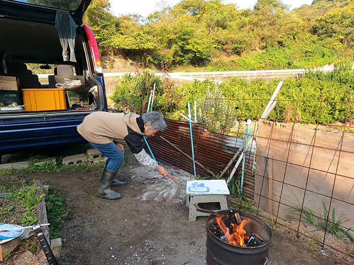 山の畑 毎朝の焚き火の後火を消す