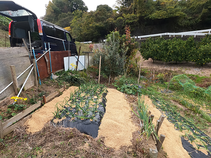 山の畑も堀江の畑も畝間には籾殻を入れる