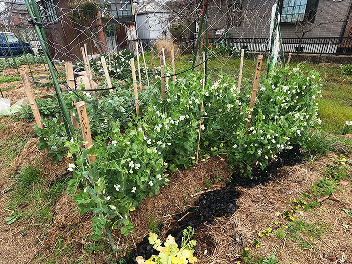このエンドウはあまり上に伸びない品種だそうです