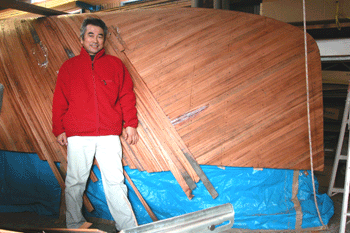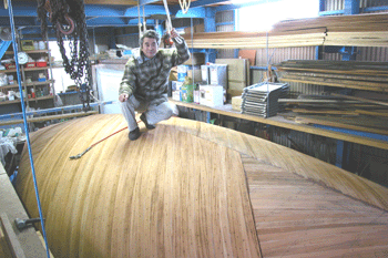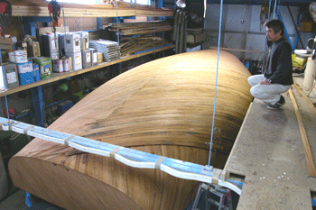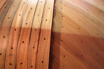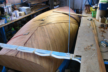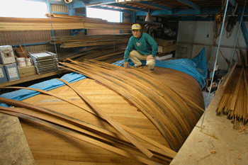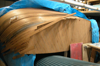 三層目外板はフレームと同じ方向に縦に張っている これで360度を6つに割った角度に外板を重ねたことになる 合板は単板と違いどの方向にでも力を発揮するし それと接合にビスや釘類を使わないので |