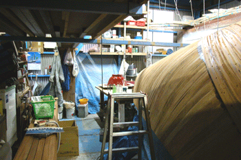 船体の真横から写した写真 左には外板材がキャスター付きの椅子二つの上に置かれている しょっちゅう物を出したら片づけないと仕事が出来なくなる 中央に見えているのはFRPで作るどんぶり鉢の型 今朝も夜中に雨が降ったのか土が濡れて湿度100% |