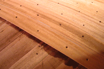 45センチメートルの距離から写した外板 下が一層目で右上が二層目 黒い●が見えるのは止め付け用木ビスを抜いた跡 この色ならマホガニーに見えますか? マホガニーにも種類がありこれは安い方のアフリカンマホガニーです |