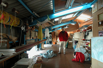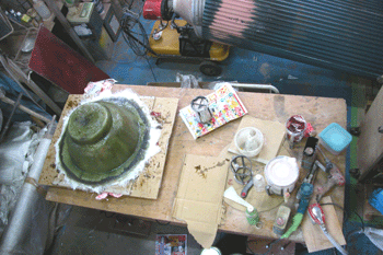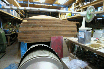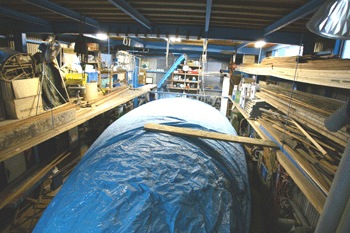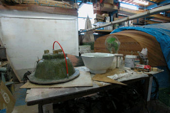 どんぶり鉢 看板屋さんから注文を受けたFRPのどんぶり鉢が量産体制に入った 右にある白いのがどんぶり鉢だ どんぶり鉢の向こうの32フィートガフケッチのトランサム(船尾)の部分も |
