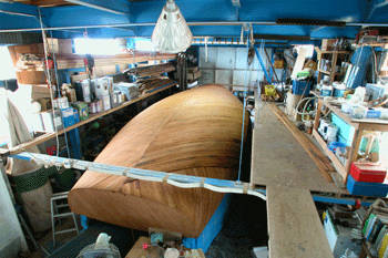 左舷外板張り二日目 一日に全体の面積の1/15くらい外板を張るのが精一杯みたいだ 大量のエポキシを使った エポキシ大工だからこれは仕方のないことだ ビス類は残さないのでモノコックの堅い船穀ができる |