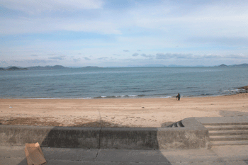 工房海側の部屋の窓から真北に見える堀江湾を写す 南側に朝の太陽があり工房の陰が砂浜に達している 真っ正面にある安居島(あいじま)は浮島現象で 砂浜にいる人は大きな弁当箱のようなカメラを三脚に乗せて