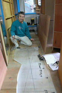 二階現図場 プロペラシャフトと船体外キール下の角度を知りたかったのと 本来なら管導材というのがプロペラの前までのびるのだが こんな部分の図面の再確認が行われようとは 私の左足に向かってのびる直線がプロペラシャフトで