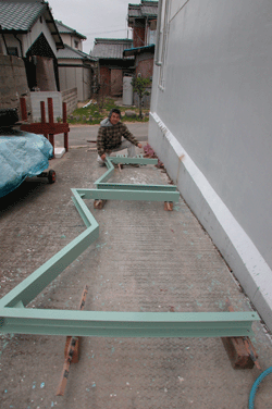 船台 私が設計した船台を外注に出し できあがってきたものにペンキを塗っている 船体に当たる部分の前と後ろのM型の船体受け部分