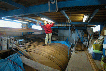32フィートガフケッチの外板張りは 次は右舷二層目を始めないといけないが 今日18日は仕事にならない |