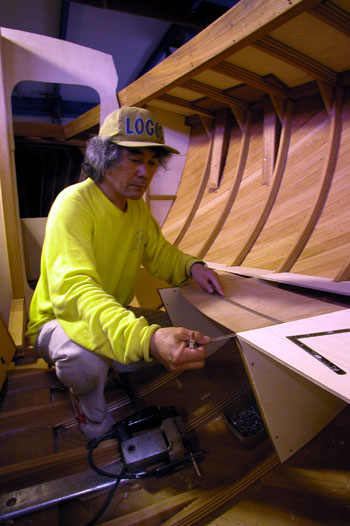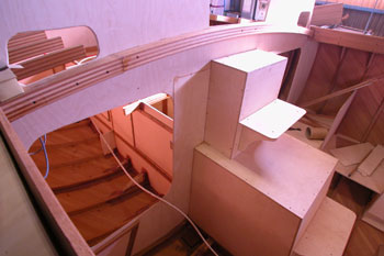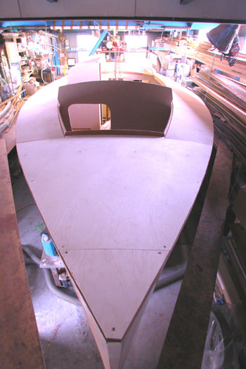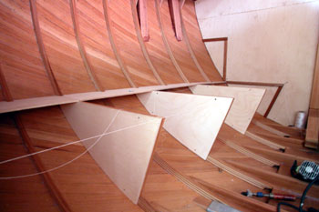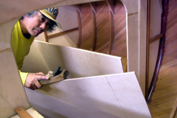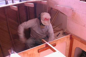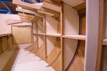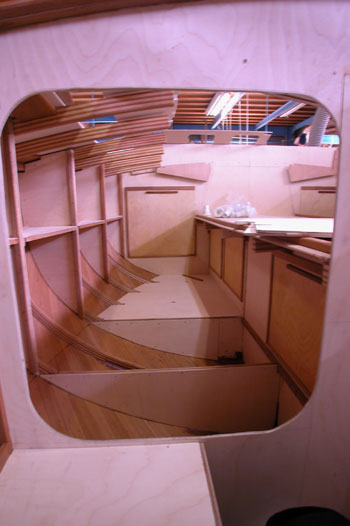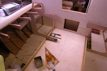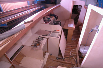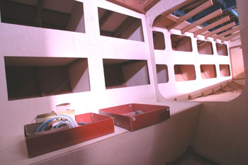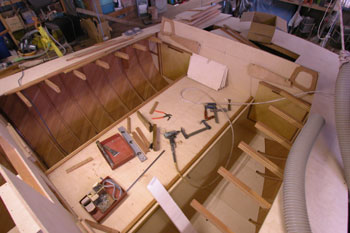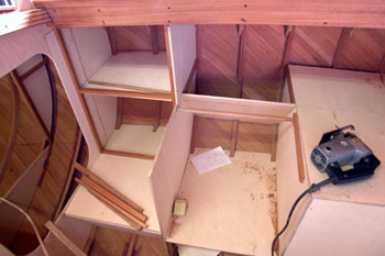 クォーターバースを左舷斜め前上から写したところ 右の床や棚を作った合板を取り外して 結構正確に左右が合うものである 夕方から雨の予報だったので トランサム物入れのハッチ穴も左右に開けた 今は後ろの方からだんだんに仕上がって行っている 今日は船首部分をやろうと思う |
