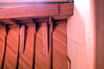 前後のバルクヘッドに根太を接着しておいて ベンチはプラスチック船と違ってきちんと座りやすいように 残り右側のベンチ兼バースを作ると |