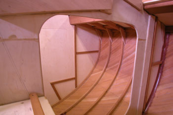 左クォーターバースを前から後ろに向かって写したところ コクピットベンチを造って空間をふさぐ前に コクピット両サイドのクォーターバースは 仕事がストップしたので 後1週間くらいすると自分の船の仕事に戻る事が出来る
