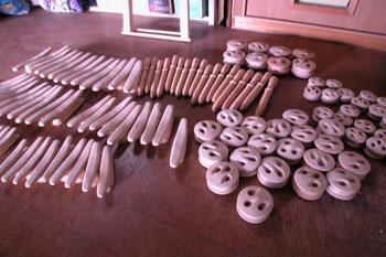 マストを支えるステーを締める為の物である 真ん中に色が違って見えているのはビレーピン 左側に見えているのはジャムックリート5種類 ほとんどがケヤキで出来ている これを作るだけでも膨大な時間を使った 今からこれらの部品を腐らないように 今となっては帆船時代の遺物とも見えるが |