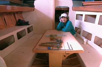 真ん中のテーブルを挟んで 物入れの入り口穴の部分には背もたれが来てフタになる これで床板を入れたら船内加工も大まかには終わる |