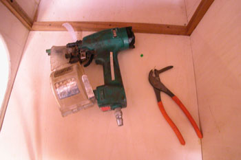 これが大活躍の仮止め釘打ち機と仮止め釘抜き 「とめ吉」という 会社が開発した物で ところが仮止め釘抜きの方は只のあごの出たペンチで