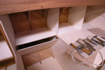 ドッグハウス入り口を降りて直ぐ右の1メートルベンチ 普通ならチャートテーブルが来る位置だ 航海中にこんな狭っ苦しい所でチャートワークなどやらない それでチャートテーブルは廃止して只のベンチにした 航海計器はこの棚の中に取り付ける事になるだろう 通路も広く取れてクォーターバースへの出入りが楽になる |