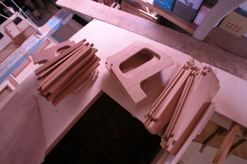 スターン左物入れの穴の回りに置いたコクピットベンチの部材 250ミリピッチで各ステーションの部分のベンチや背もたれ クォーターバースが仕上がったらこれらをデッキフレームに固定して でもなかなかクォーターバースが仕上がらない フィレット付けや棚表板取り付けやエバデュアーの塗りをしないといけない