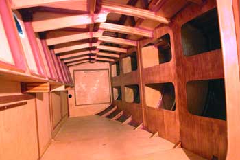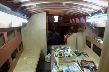 メインキャビンを後方から見たところ テーブルを挟んで両側に4人ずつ座れる座席兼寝床がある 右側は船首船室への通路となっているので 航海中はそれほど必要なスペースとも思えないが 港に入ったら交流の場となるだろう そういえば市販の船はどれも豪華なメインキャビンを持っている 私の船は航海中風通しがもっとも良くて安定する通路で寝るのがメインの |