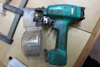 「とめ吉」という会社の「ダン」 マシンガンの弾倉のようにベルトに並んだ仮釘をダン ダン ダンと打ち込む 普通家具屋さんなどで使われるものだそうだ エポキシが乾くまでの24時間接着物を仮に止めておく 優れものだがあまり出回らないせいかいかにも値段が高い 仮釘は打つよりも抜く方が大変だ 仮止め釘を抜くエアーツールを作ってほしいと「とめ吉」(株)に頼んだが