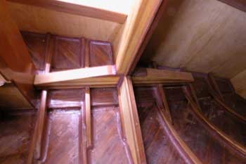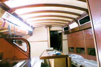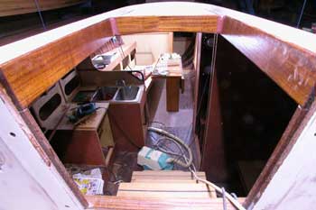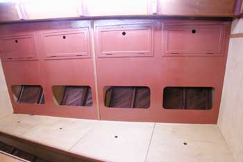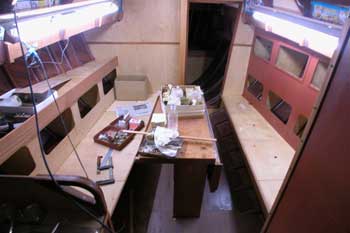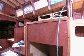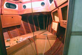 船内船首船室から後ろを見たところ メインテーブルの翼は折って右舷通路を通りやすくしてある 全部の棚の表面板も取り付け大分船室らしくなってきた 結構狭くて面倒な仕事である スピードメーターと測深計を取り付ける穴も開け あっという間に一日が終わった