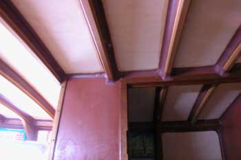 キャビン天井を低粘度エポキシ塗り たった一度の塗りでちょっと光った部分ができてしまった こてこてに光った船内は何となく居心地が悪い 自分の船だから天井の塗りは低粘度エポキシ一度だけにする それにしてもとんでもない臭いに工房じゅうが包まれた |
