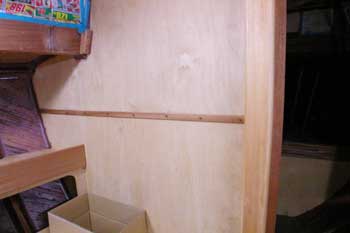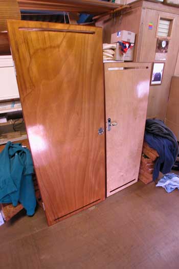 船首船室の物入れ扉取り付け 図面とは違うが船首は個室で 昔の帆船では船首は下級船員の居住場所と決まっていた 今のヨットではそれは成り立たない 船首は軽くしておきたいがどうしてもアンカーチェーンや その他物入れは沢山あるが |
