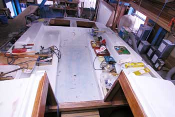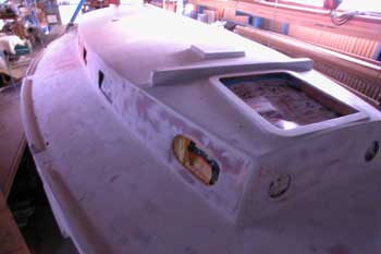 船首右側から写した写真 ドッグハウスの窓やバウハッチや こんな凸凹が無ければ仕事はずっと早いのに エポキシのサンディングは硬くてサンドペーパーも直ぐにだめになり またもや腰が痛くなったのでぶら下がり器にぶら下がらないといけない |