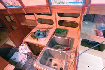 ギャレーの回りも大分仕上がってきた 棚も板も接着し合板の木口には縁回しを付けた 家庭の炊事場と比べるとずいぶんと小さいが 深いシンクが二つあり洗い物も楽だろうと思う 青いジグソーを置いてあるところが調理台で コンパクトにまとまっている