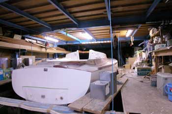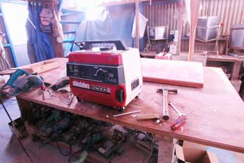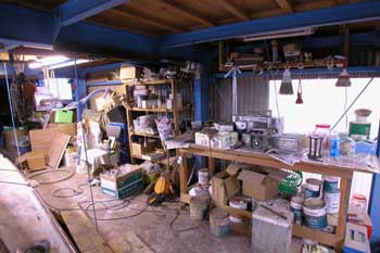 中二階へ通じる工房一番奥の階段通路上から作業机を写す この写真で言うと左が通路で下側に船の船尾が来る テーブルの上に置いてあるのは手前がキャビン入り口スライドハッチの戸袋 一番右に白く大きく写っているのは これを回すと工房の扉が勝手にドンと閉まるほど強烈だ 工房の床に池を掘り自分で作った物だが工房中で一番高い道具だ