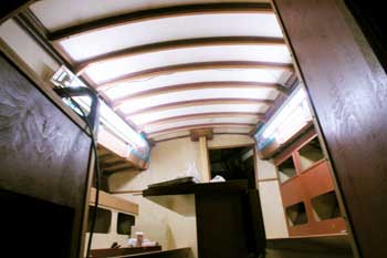 船体右舷側にある中二階の作業スペース 幅が180センチ長さが9メートルある 部品を置く棚があったり 大きい木工仕事以外は何でもほとんどこの作業テーブルでこなす 今テーブルの上にはラジオと 仕事に熱中しすぎて長く整理をしていないので 今朝は朝から雨なので中二階の片づけからかかろうと思っている |