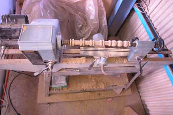 maid in U.S.A.木工旋盤 鋳物のしっかりした物で回転数も変えることが出来る 中二階隅にナイロン袋と毛布を掛けて 眠っていたが 写真右3個が数珠玉で 数珠玉は16個 糸巻きは10個必要だ 雨が降ると変わった仕事がしたくなる |