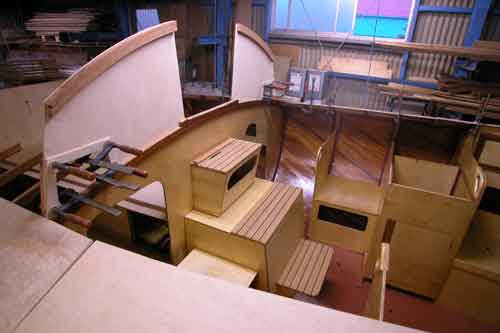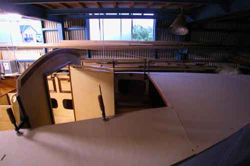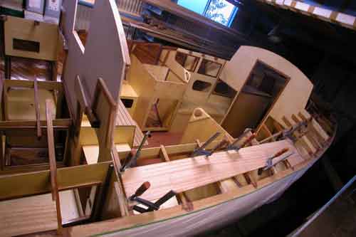 梅雨が近いのであわててデッキを接着した カーリン(ドッグハウスとデッキの繋ぎ材)の部分が出来ていないが メインデッキキャンバー4000Rはいかにもきついなと感じる 今日はコクピットコーミングの角を通る材を入れる |