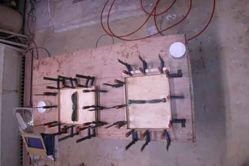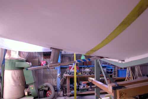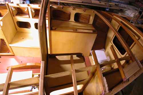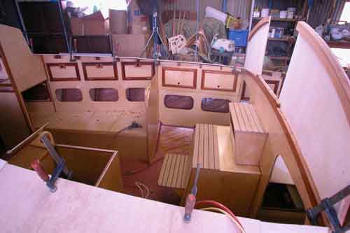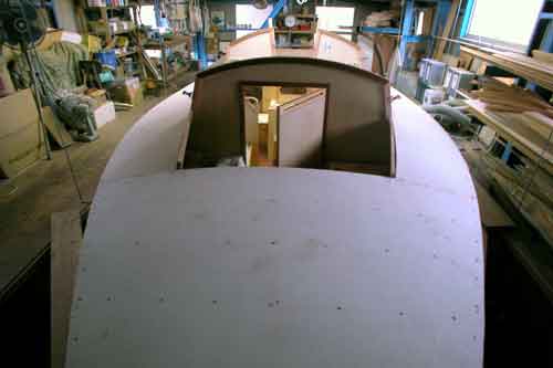 船首船室への扉も仮に取り付けてみた コクピットの骨組みを月曜日から始めるつもりだ 今朝は曇っていて昨日50%を切っていた湿度がまたもや75%を超えている |