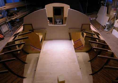 仮にデッキを全面伏せてみる なかなか良い感じの船全体が見えてきた 連れ合いに頼んでいたバースクッションも昨夜全て完成した 今日はパソコン机とメインテーブルを始めようと考えている |