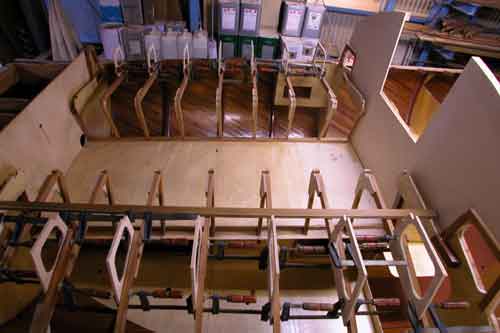土曜日コクピットコーミングの中央を貫く穴を空けた 昨日はこの船のオーナーが見えたので晴れて湿度も下がったが いよいよ今日からコクピット座席骨組みの接着に取り組もう |
