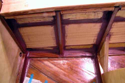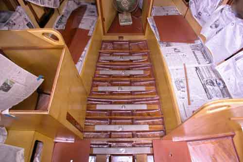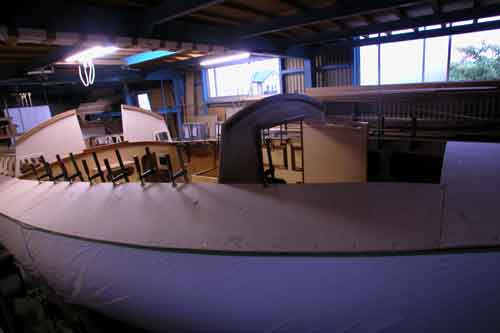 左舷デッキ下のマイクロバルーンエポキシフィレット付け 上に向かってフィレットを付けるのは足場も悪く大変な仕事だ 船首の人が入りにくい部分に電球を付けて潜り込み上に向かってのフィレット付けは デッキのフィレット付けは右舷を残すのみとなった これからは部品取り付けと