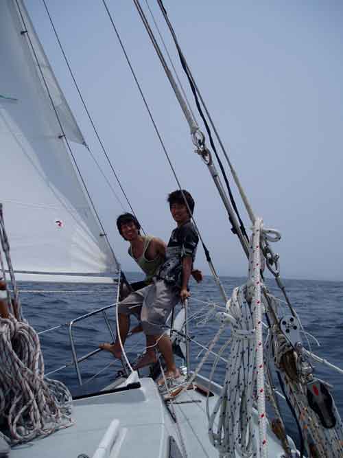 6月19日(日曜日) 山梨県から長男 真澄人君(写真左)と大阪にいる三男 真君が花丸に乗りに来た セールバランスさえとれておれば舵は軽い物だ
