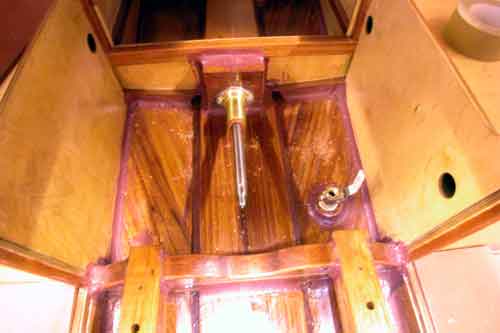 プロペラシャフトが通るスターンチューブを固定した 船体と真鍮のパイプ隙間を埋めるのに 写真右側に見えているのはエンジン冷却水バルブ 船底の穴はエンジン冷却水 |