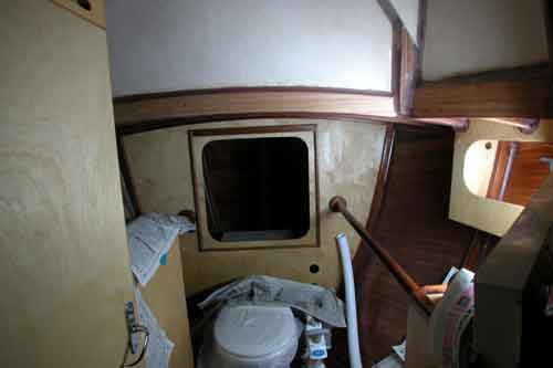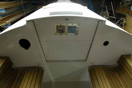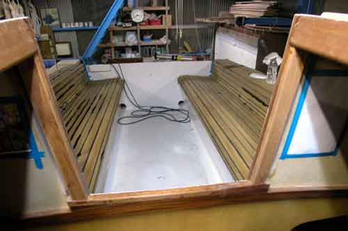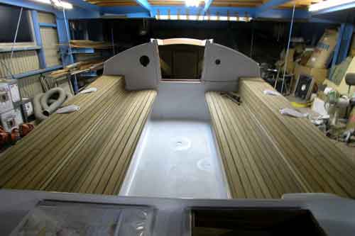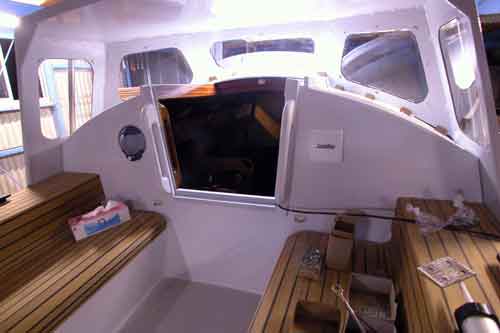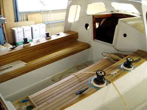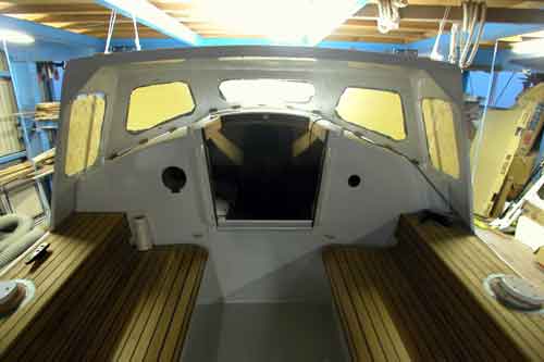キャビン入り口からコクピットを見たところ コクピットベンチの形がよく解る 右舷はサンディングして2回目のチーク目地用黒色シーカフレックスを入れた |